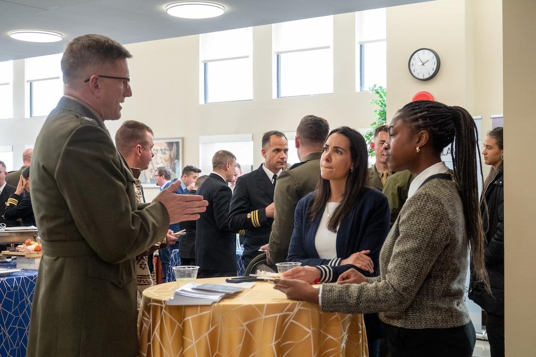 On April 2nd, the National Security, Cybersecurity, and Foreign Relations Law Program along with the Military Law Society and National Security Law Association hosted the Navy-Marine Corps Court of Criminal Appeals for an oral argument, followed by a Q&A session and a reception. The appellate judges who sat to hear the case included Senior Judge (Colonel) Alison Daly (presiding) and Judges (Captain) Nathaniel Gross and (Lieutenant Colonel) Keaton Harrell. As part of their public outreach, military criminal appellate courts have held annual appellate court hearings for actual cases at GW Law since 2009.